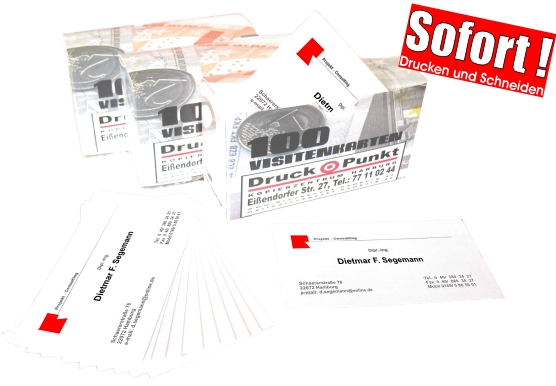 Sie brauchen sofort Visitenkarten? – Wir können das! Druck und Schneiden der Karten passiert sofort. Keine leeren Webseiten-Versprechungen: Innerhalb der Öffnungszeiten stehen wir am Tresen mit Maschinen und der nötigen Fachkompetenz zu Ihrer Verfügung. Einen Termin brauchen Sie nicht. Abhängig von Ihrer Vorbereitung wird entweder sofort layoutet, oder beim bereits erstellten Grafikentwurf nur gedruckt und geschnitten. Erstmal begonnen, dauert der ganze Vorgang allenfalls eine halbe Stunde.